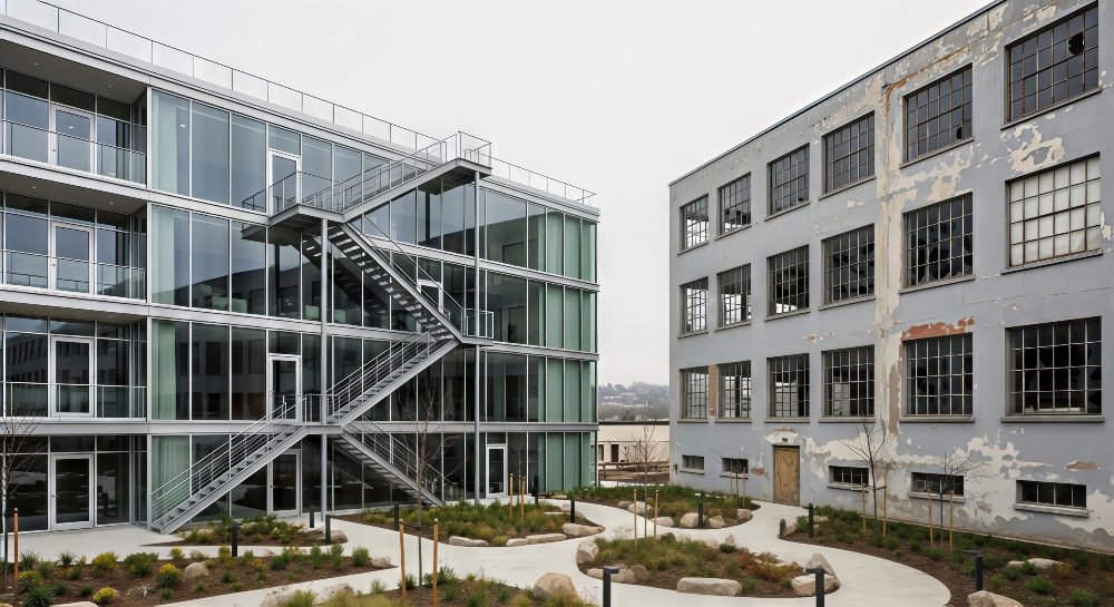 Modern glass building with external staircase next to old industrial building. Urban architectural contrast of gentrification. SSUCv3H4sIAAAAAAAACpyRTW7DIBCF95V6B4t1LGHjn7hXiboYA7VHIRABTlVFuXsx2Bbddsd8Mzy9N/N8fysKMoJDTj6K51qFGpVanLfg0eiA6WnjVmohbU4elnU0B4B5JQV6YxFUDkfwfNZwkwHqRakVv2KTOA9+cdKtXjbEwcspaCR4SCTDl1QXeyM2w4/QIuSUMbeMke0oif/rZ3p8HoEnqflPNJwFsVJJSEEuaZRcv720tzwaLAJNluphOKh1gGVKgHew8Off3SJHPWXE+Dne5VhaOJ+5ZUAbH81s2YgIW13LijW0Gqqu7ll9blvWD9tAusSMQcemdDs3/Ioit4NiVYJzx6RsaNm2TVU20LNyYKwrv5qqHmlPawpjWOLrFwAA//8DADrOJaJyAgAA